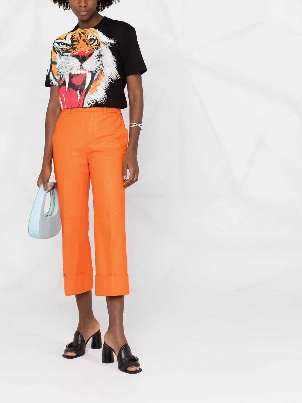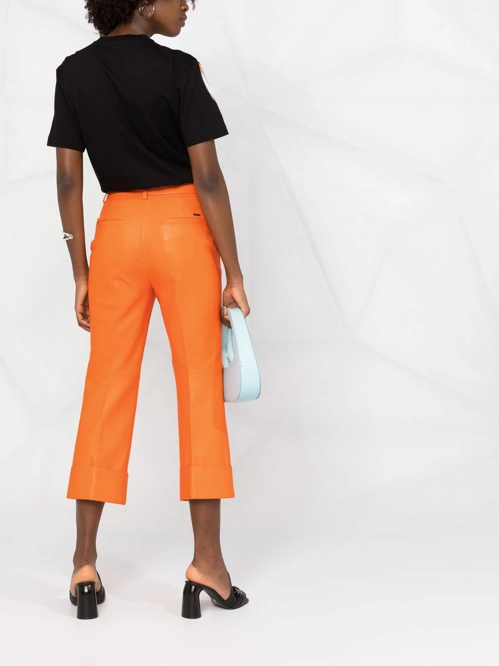 Plaque logo, passants de ceinture, fermeture dissimulée sur le devant, poches latérales fendues, poches arrière passepoilées, ourlet retroussé. Couleur : orange. Matière : cuir.