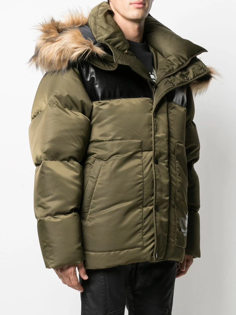Capuche à bordure en fourrure artificielle, design matelassé, logo imprimé sur le devant, col montant, fermeture à zip et boutons sur le devant, manches longues, poignets nervurés.