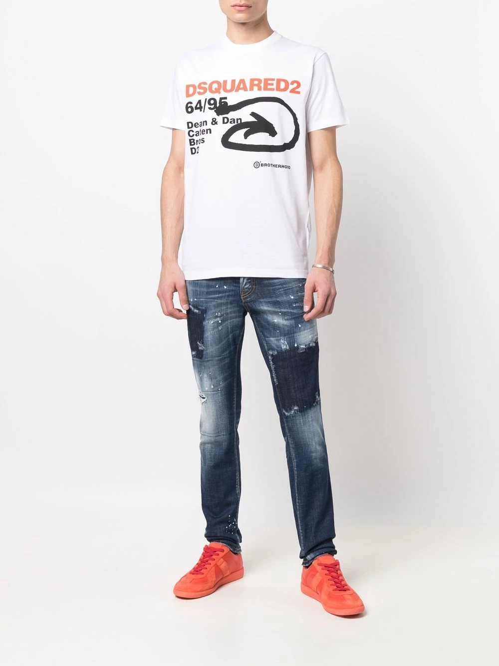 Patch logo sur l’arrière, effet délavé, effet taches de peinture, effet usé, coupe fuselée, cinq poches classiques, passants de ceinture, fermeture à braguette dissimulée et bouton. Couleur : bleu. Matière : coton mélangé.