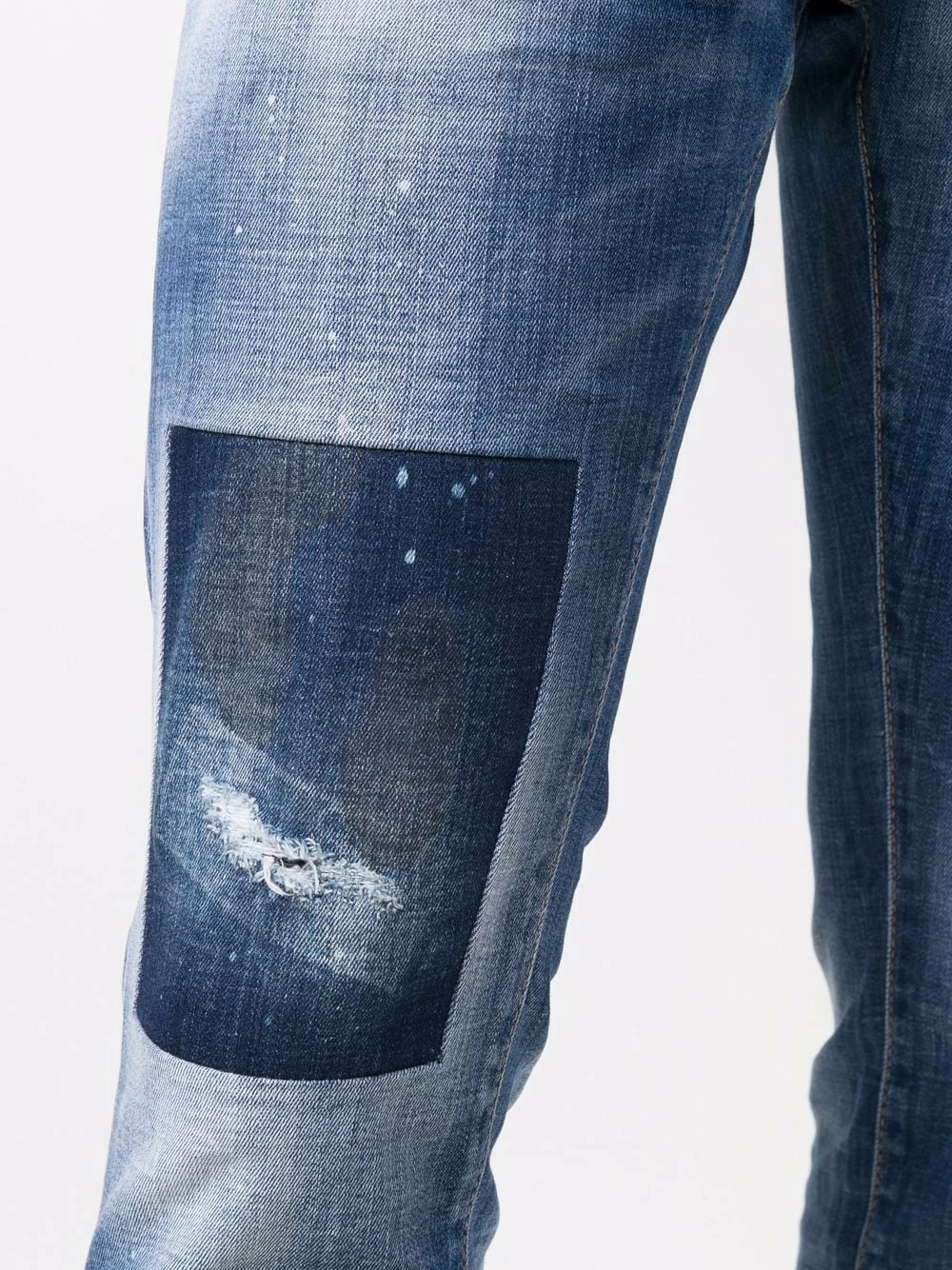 Effet délavé, effet usé, détail de patch, taille mi-haute, fermeture boutonnée, passants de ceinture, cinq poches classiques, coupe slim.