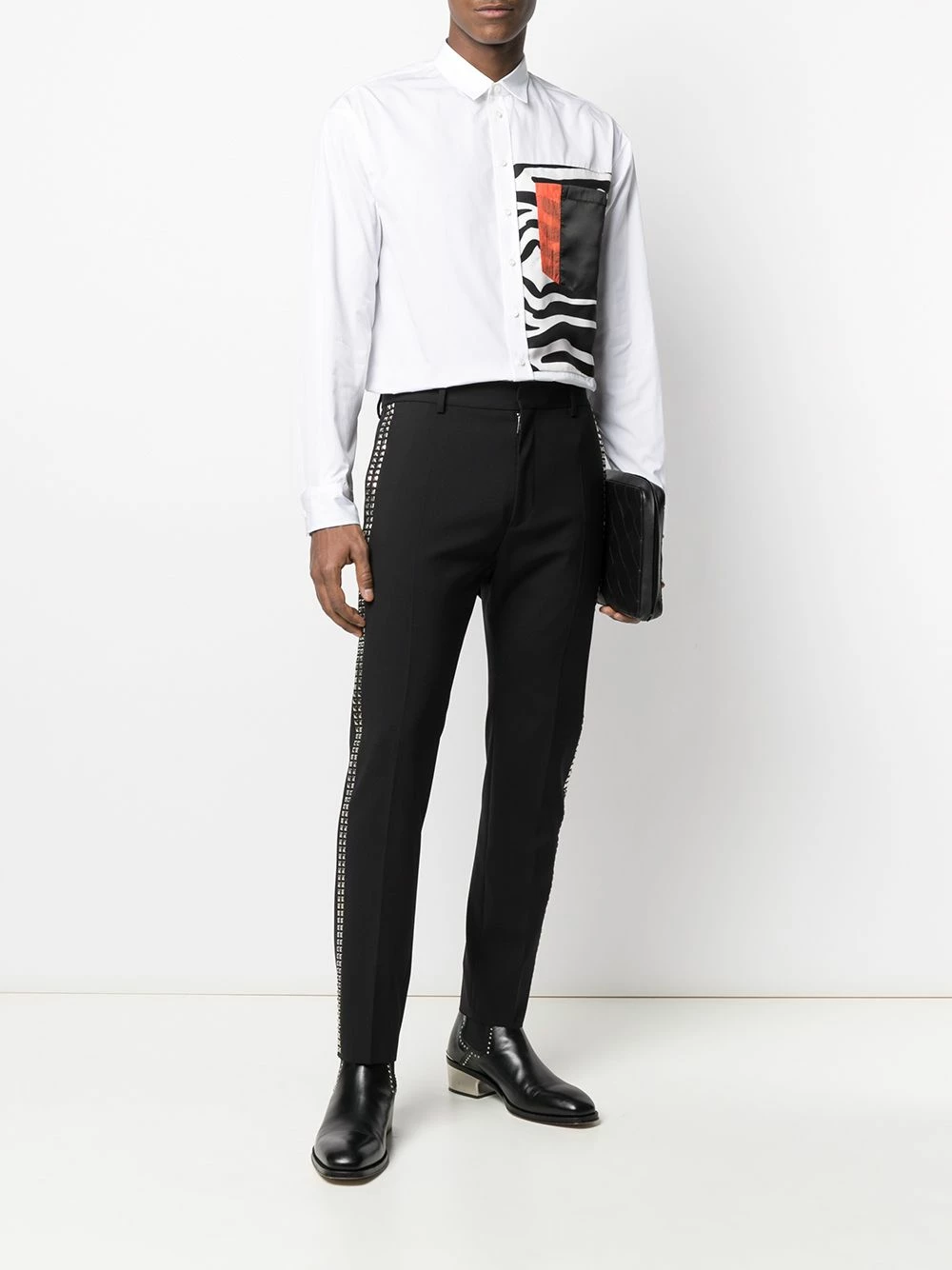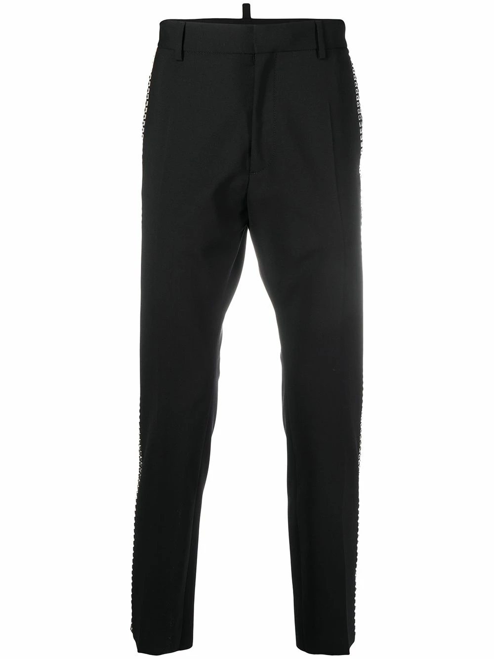 Coupe ajustée, détails de clous argentés, plis marqués, passants de ceinture, fermeture dissimulée sur le devant, deux poches latérales passepoilées, poches arrière passepoilées. Couleur : Noir.