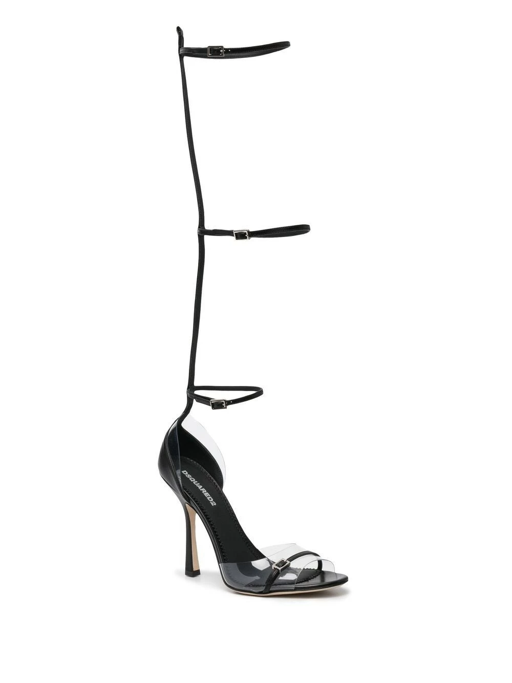 Empiècement transparent, bout ouvert, fermeture à boucles sur les côtés, ornements argentés, semelle intérieure à logo. Couleur : noir. Matière : cuir.