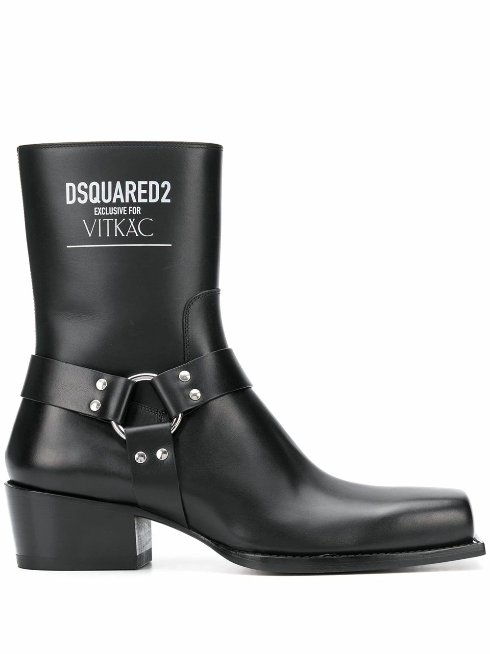 Bottines Exclusive pour Vitkac en cuir Dsquared2 avec détails de clous argentés, logo imprimé, bout carré, fermeture zippée latérale et petit talon épais. Couleur: noir. Cette pièce est une exclusivité.