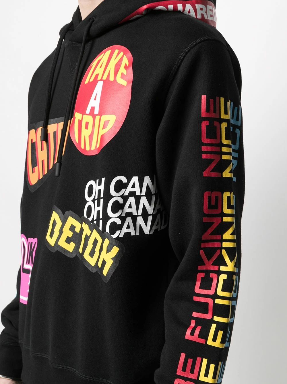 Slogan imprimé, motif imprimé, capuche à lien de resserrage, effet d’épaules descendues, manches longues. Matière : coton.