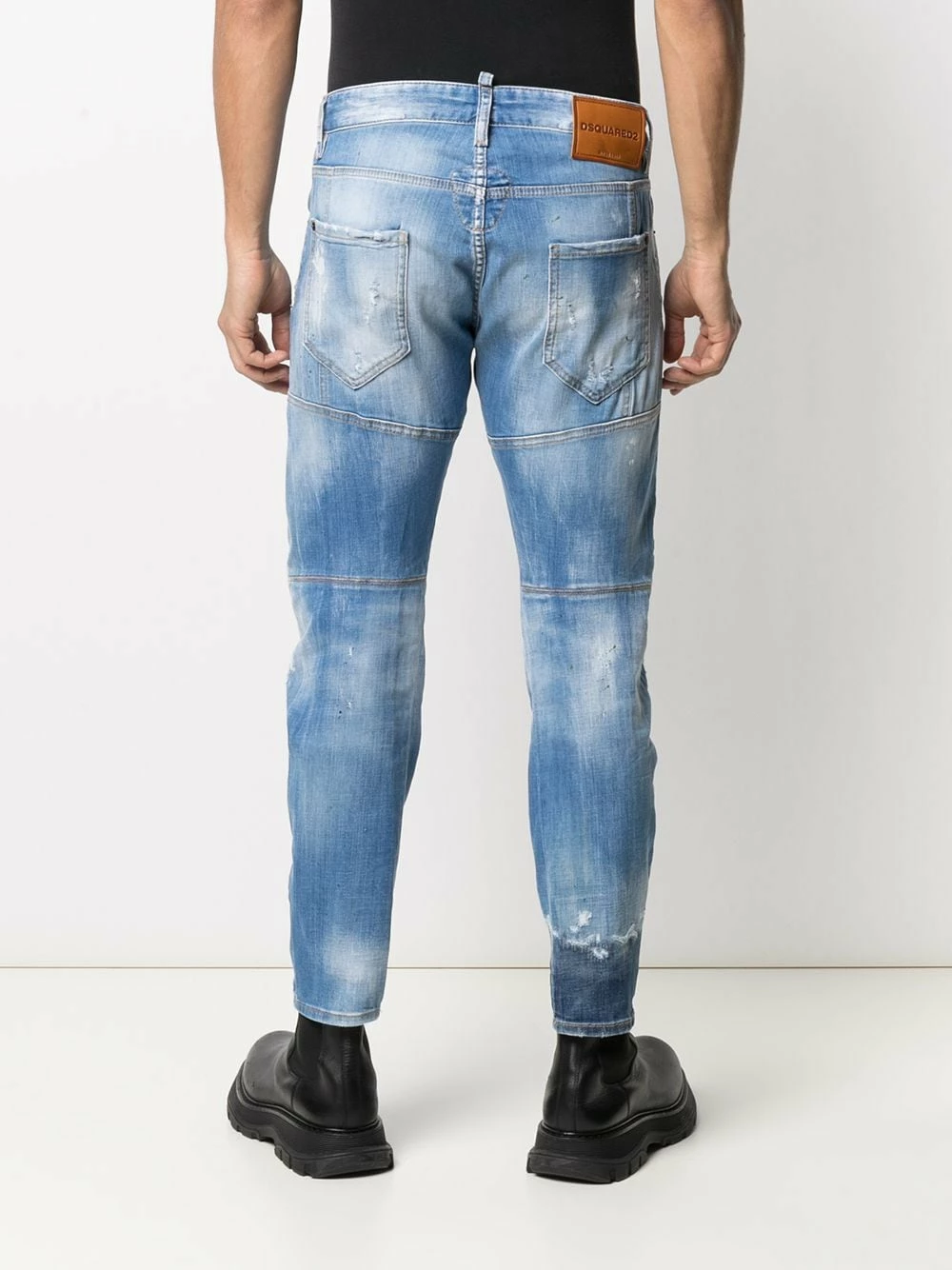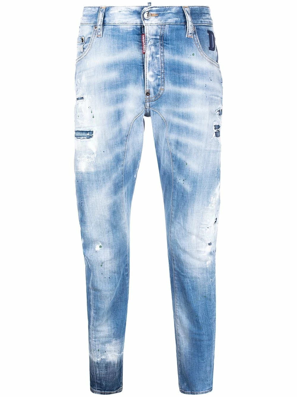 Patch logo sur le côté, patch logo sur l’arrière, finitions effilochées, taille mi-haute, passants de ceinture, boutonnière sur le devant, 5 poches classiques, coupe droite. Couleur : bleu.