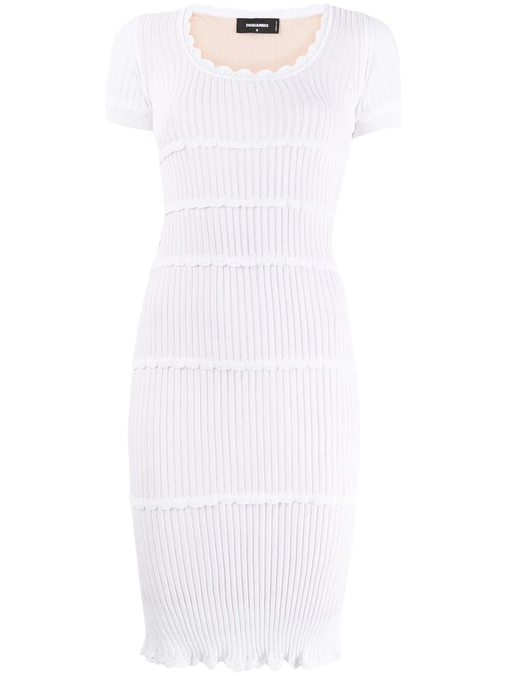 Maille nervurée, détails de volants, construction stretch, encolure arrondie, manches courtes, bordures festonnées. Couleur : Blanc.