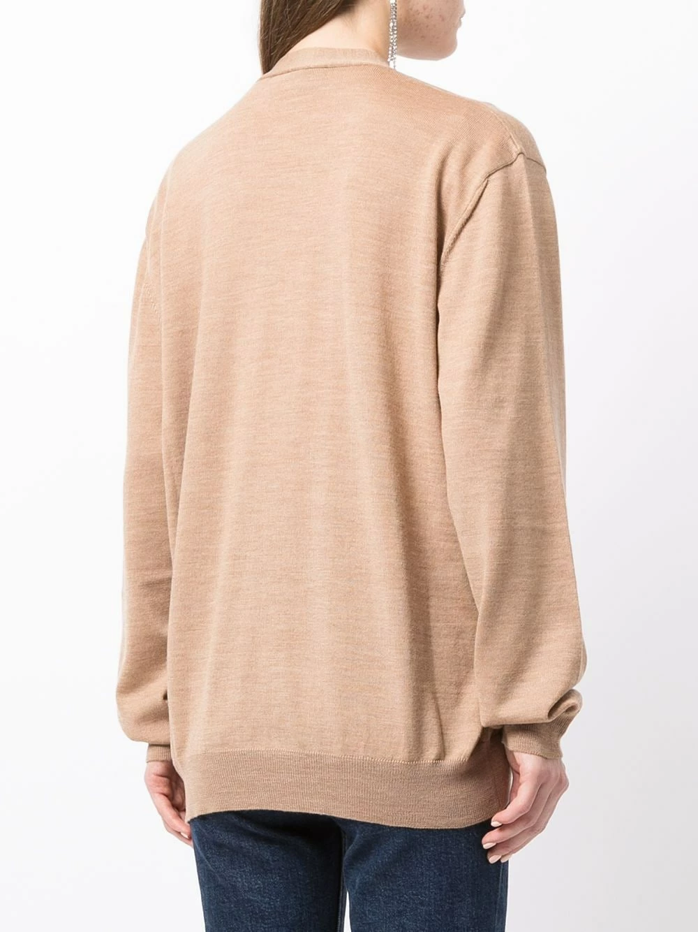 Appliqué, col v, boutonnière sur le devant, effet d’épaules descendues, manches longues, deux poches plaquées avant, ourlet nervuré. Couleur : marron. Matière : laine.