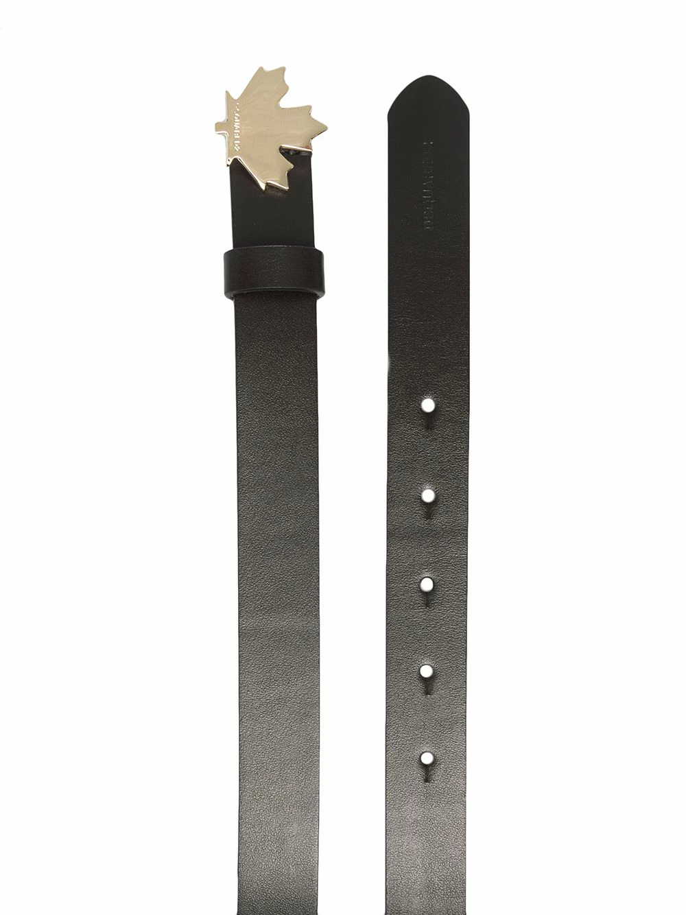 Détail de boucle à logo, taille ajustable. Matière : cuir de veau.