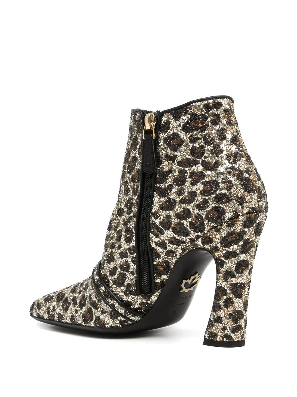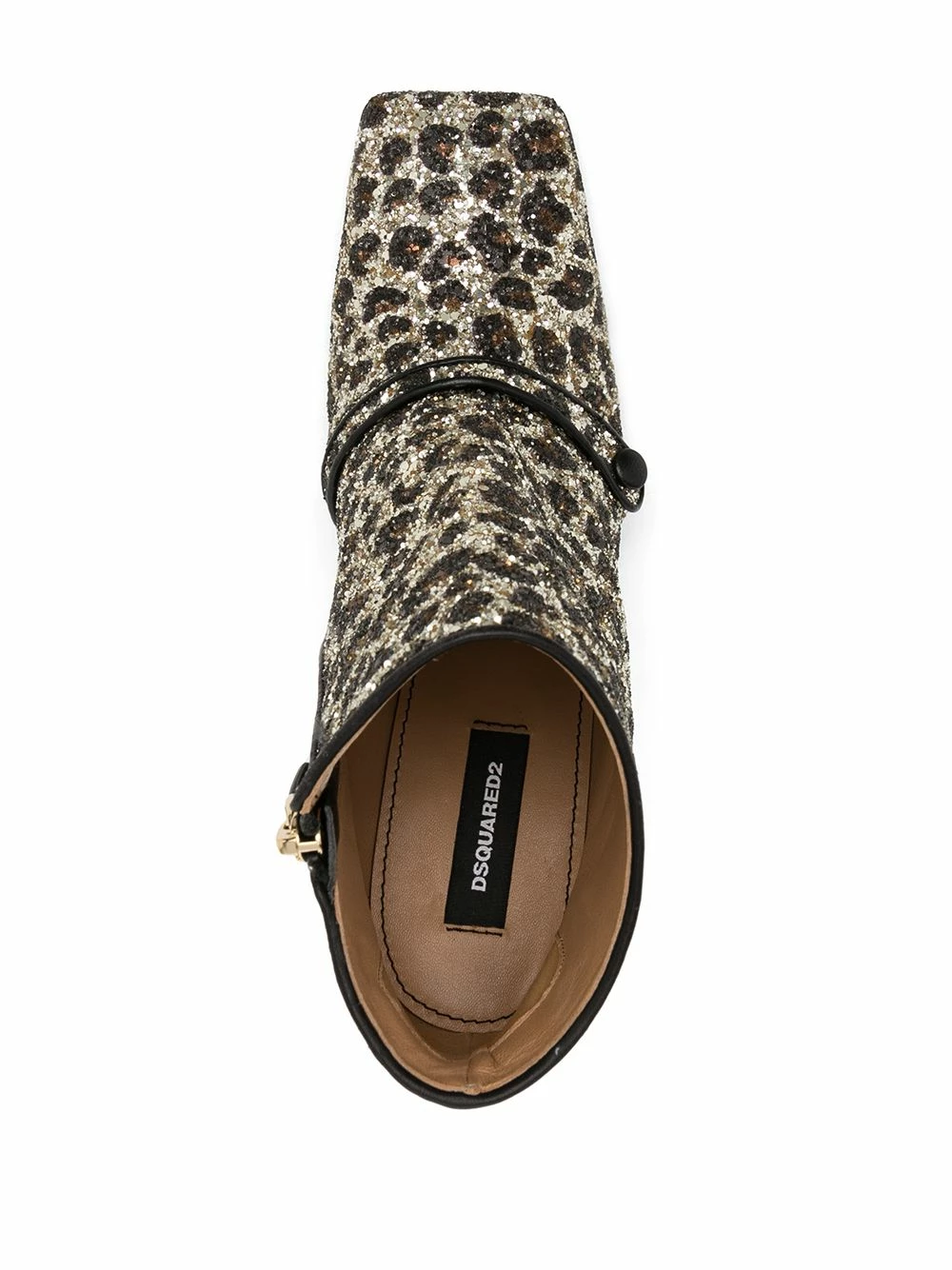 Détail pailleté, imprimé léopard, bout carré, talon haut épais, hauteur cheville. Couleur : marron.