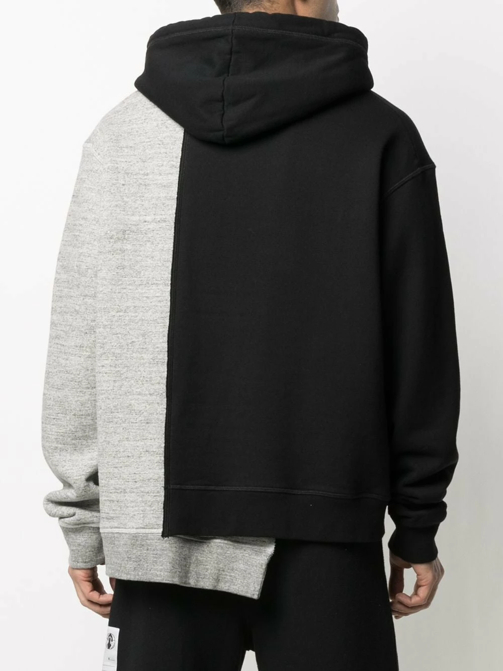 Modèle bicolore, design asymétrique, logo imprimé à la poitrine, capuche à lien de resserrage, manches longues. Matière : coton.