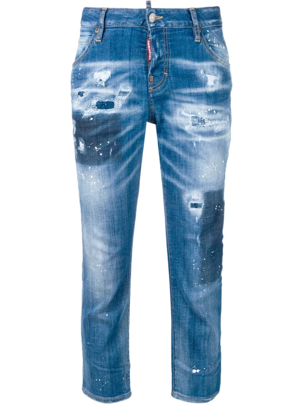Jean crop à effet usé Dsquared2 avec passants de ceinture à la taille, bouton et zip, coupe classique cinq poches, longueur crop, patch à logo à l’arrière, finitions à effet usé, effet usé, effet usé et détail de coutures visibles.