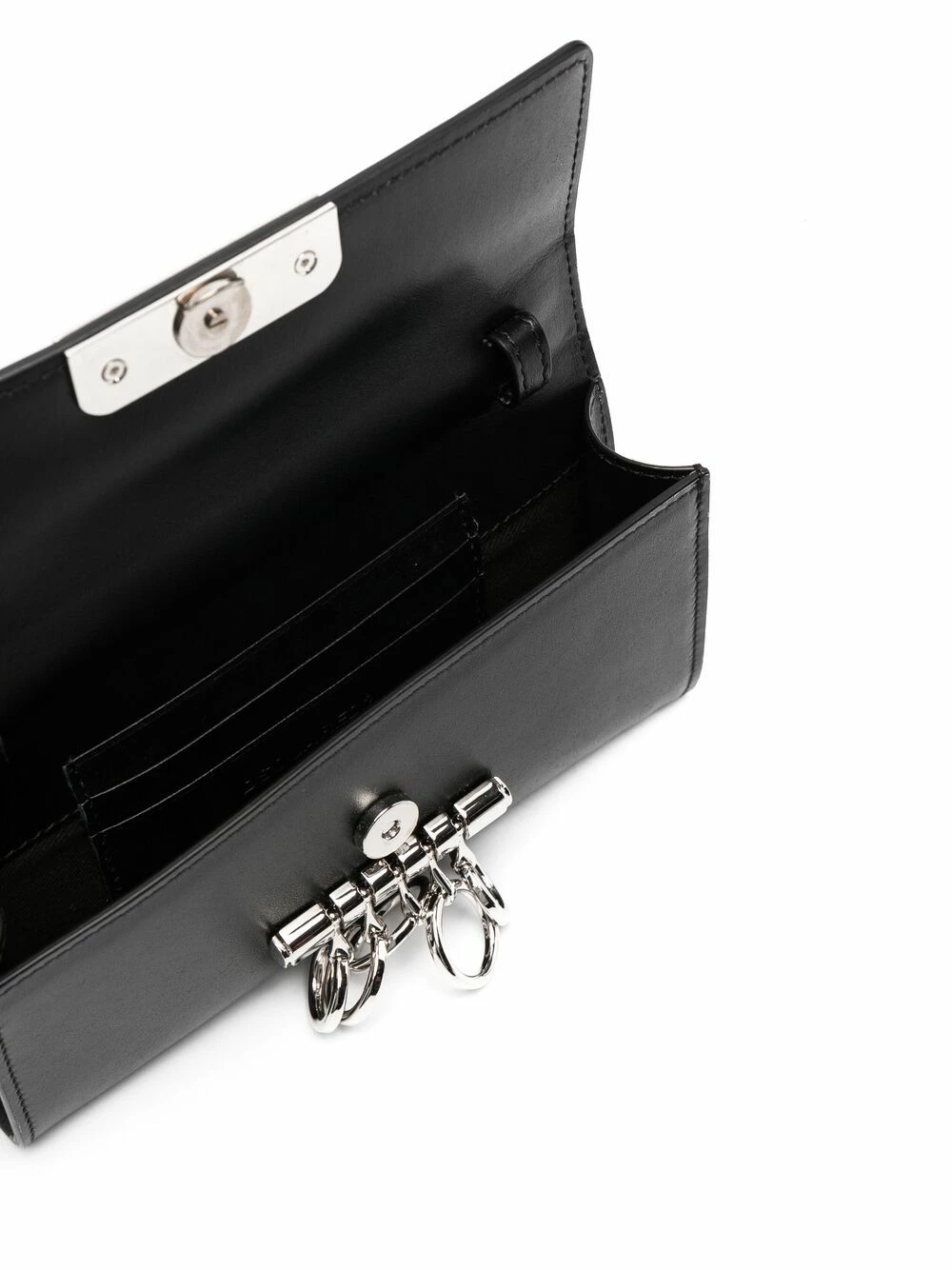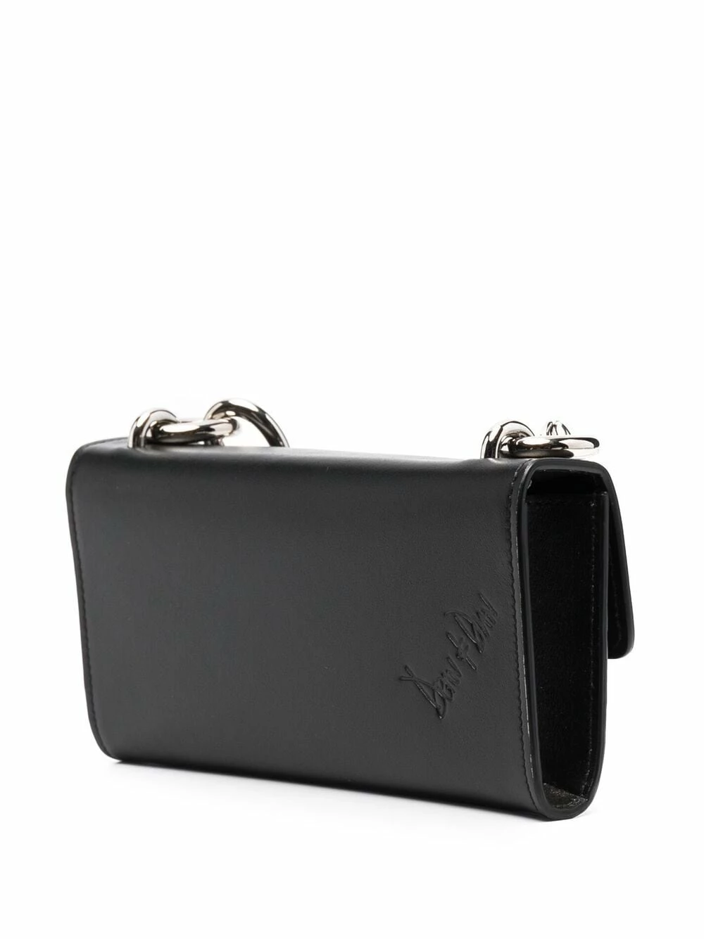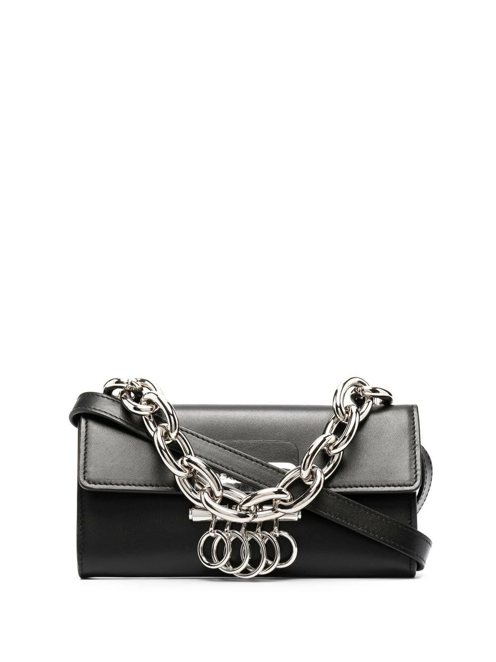 Attache porte-clés, logo gravé, patch logo embossé sur l’arrière, rabat sur le devant, fermeture magnétique, bride porté épaule en chaîne, bride porté épaule détachable et ajustable, compartiments intérieurs pour carte. Couleur : noir. Matière : cuir.