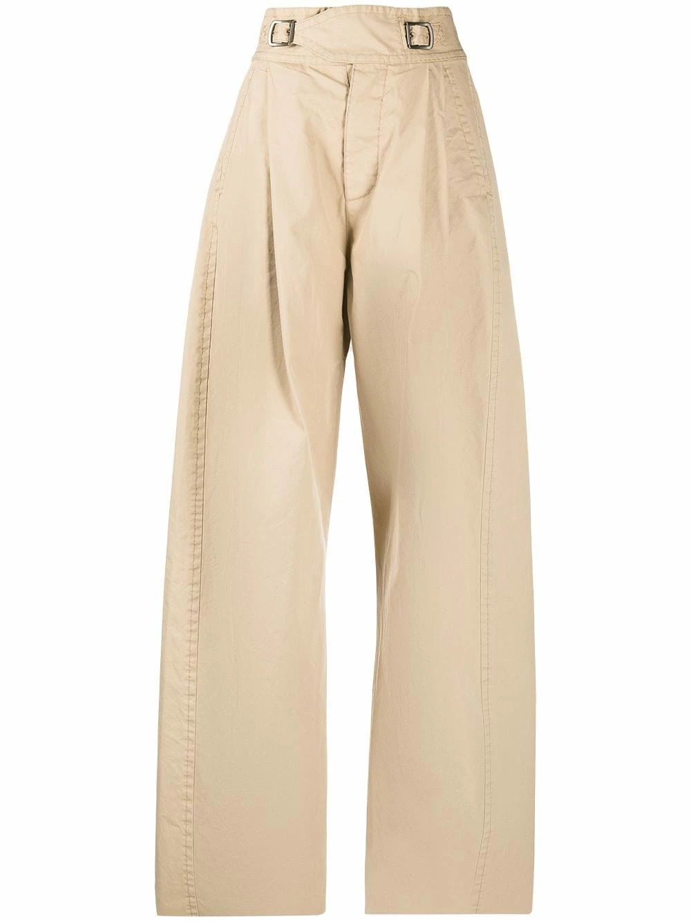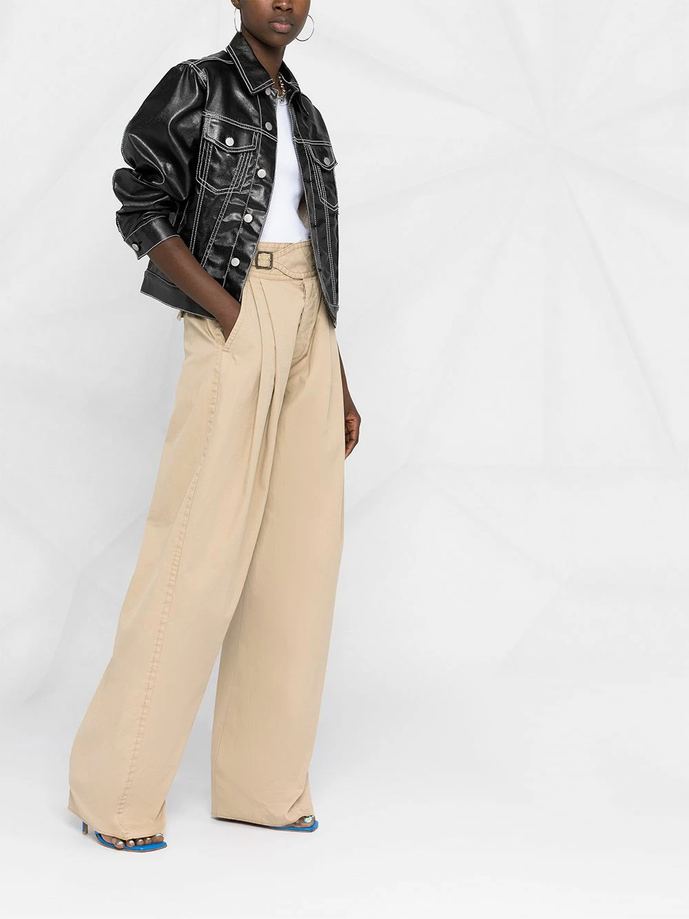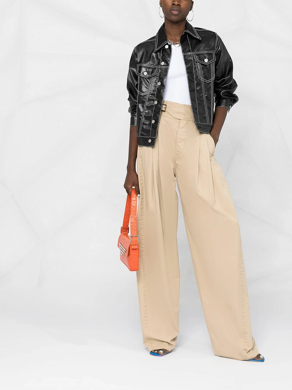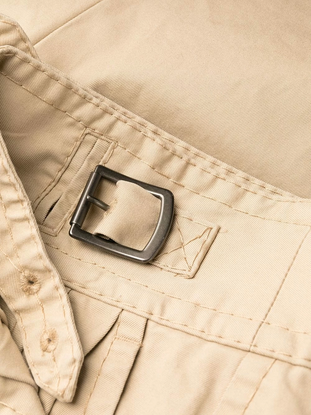 Taille haute, coupe ample, taille ceinturée, détails de plis, deux poches latérales passepoilées, poches arrière à rabat. Matière : coton.