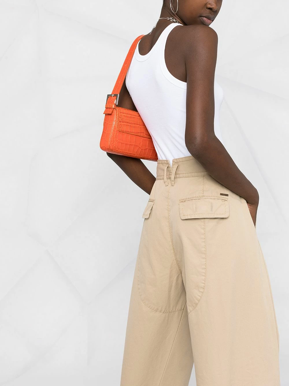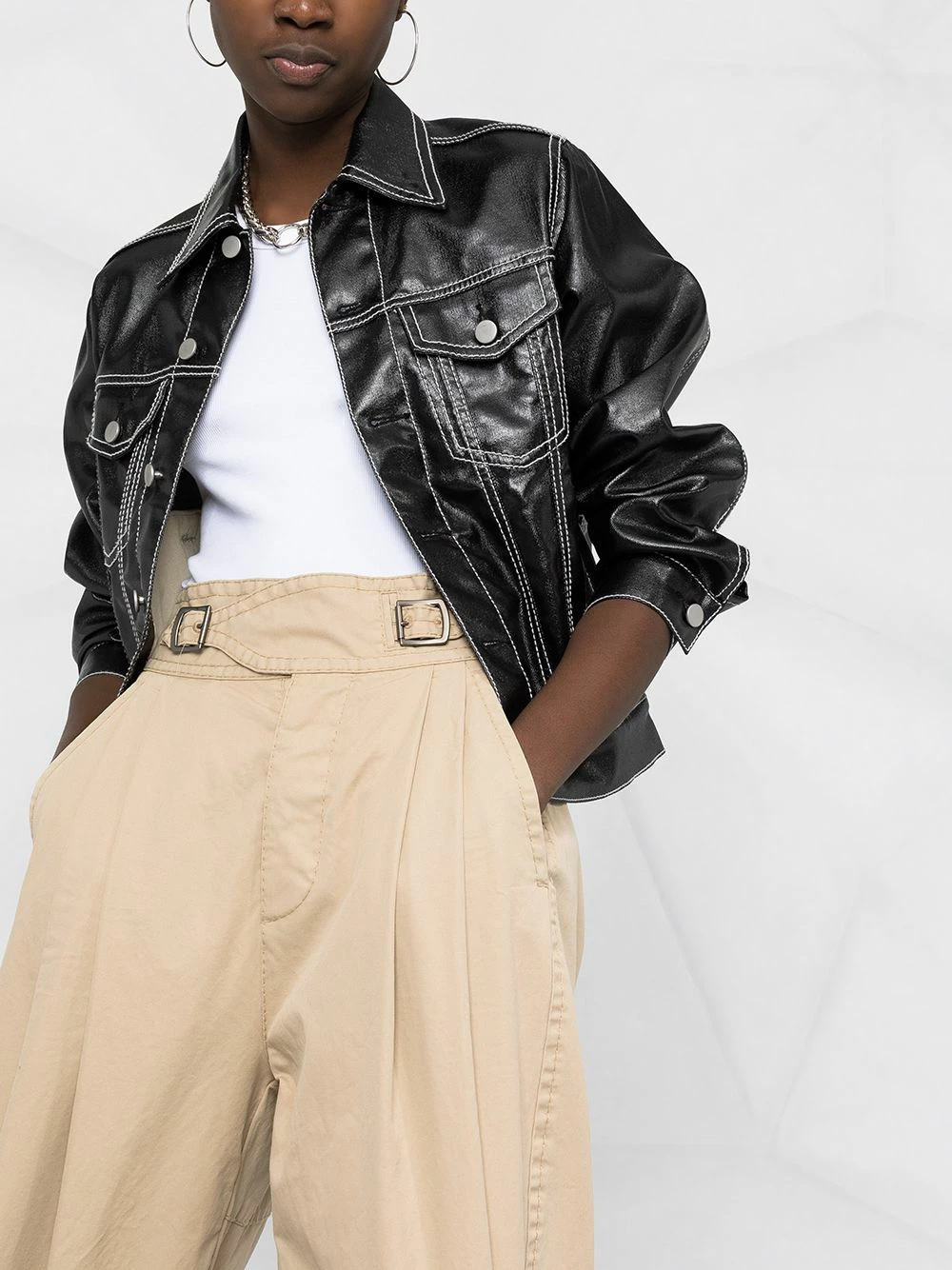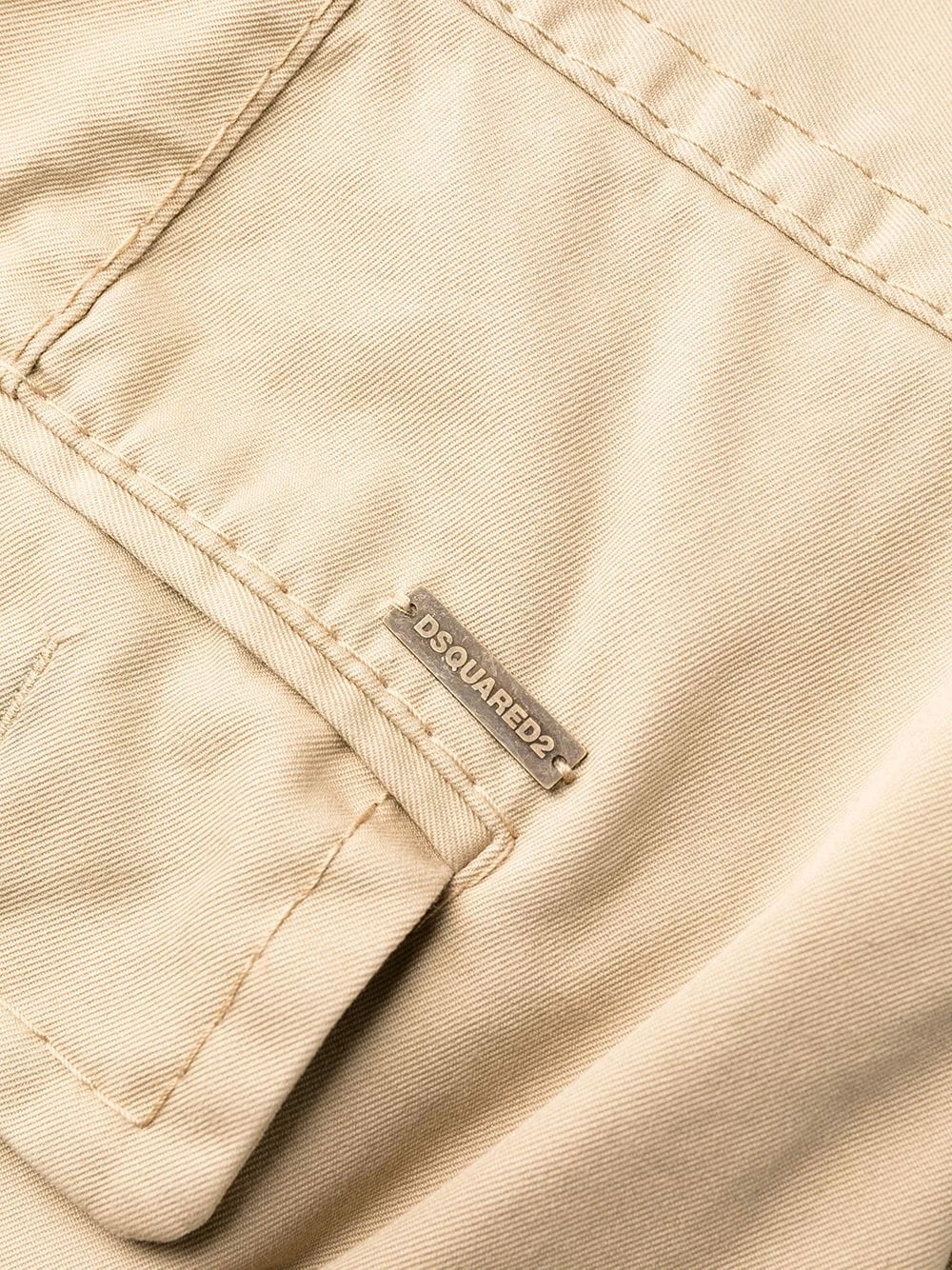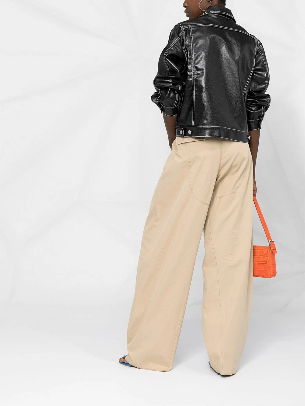 Taille haute, coupe ample, taille ceinturée, détails de plis, deux poches latérales passepoilées, poches arrière à rabat. Matière : coton.