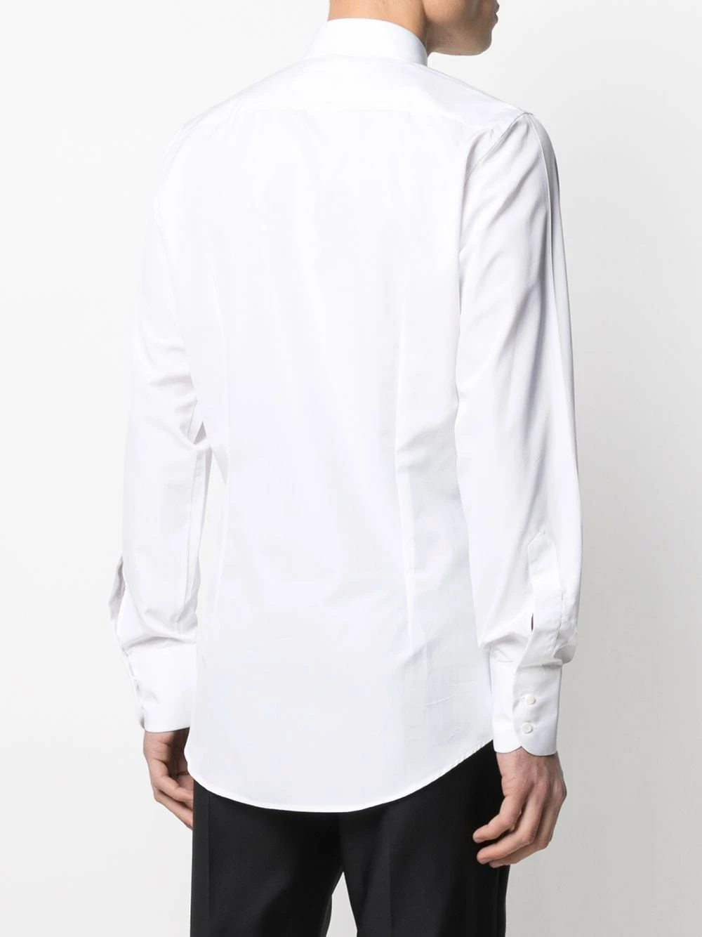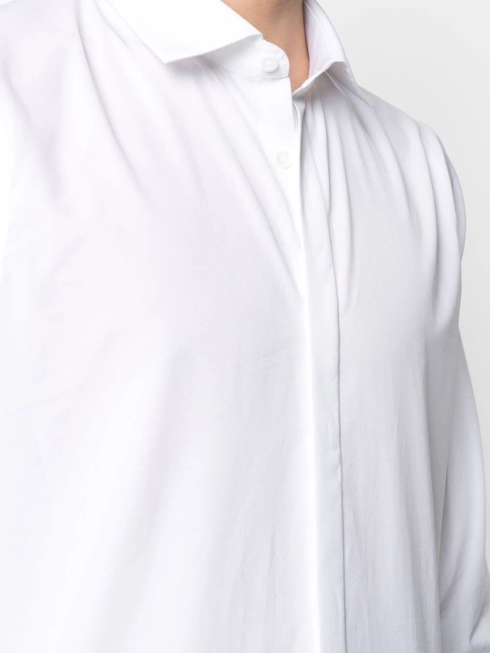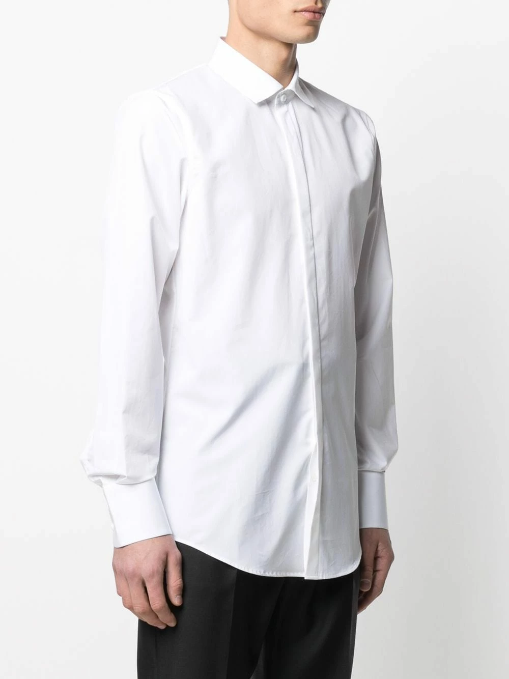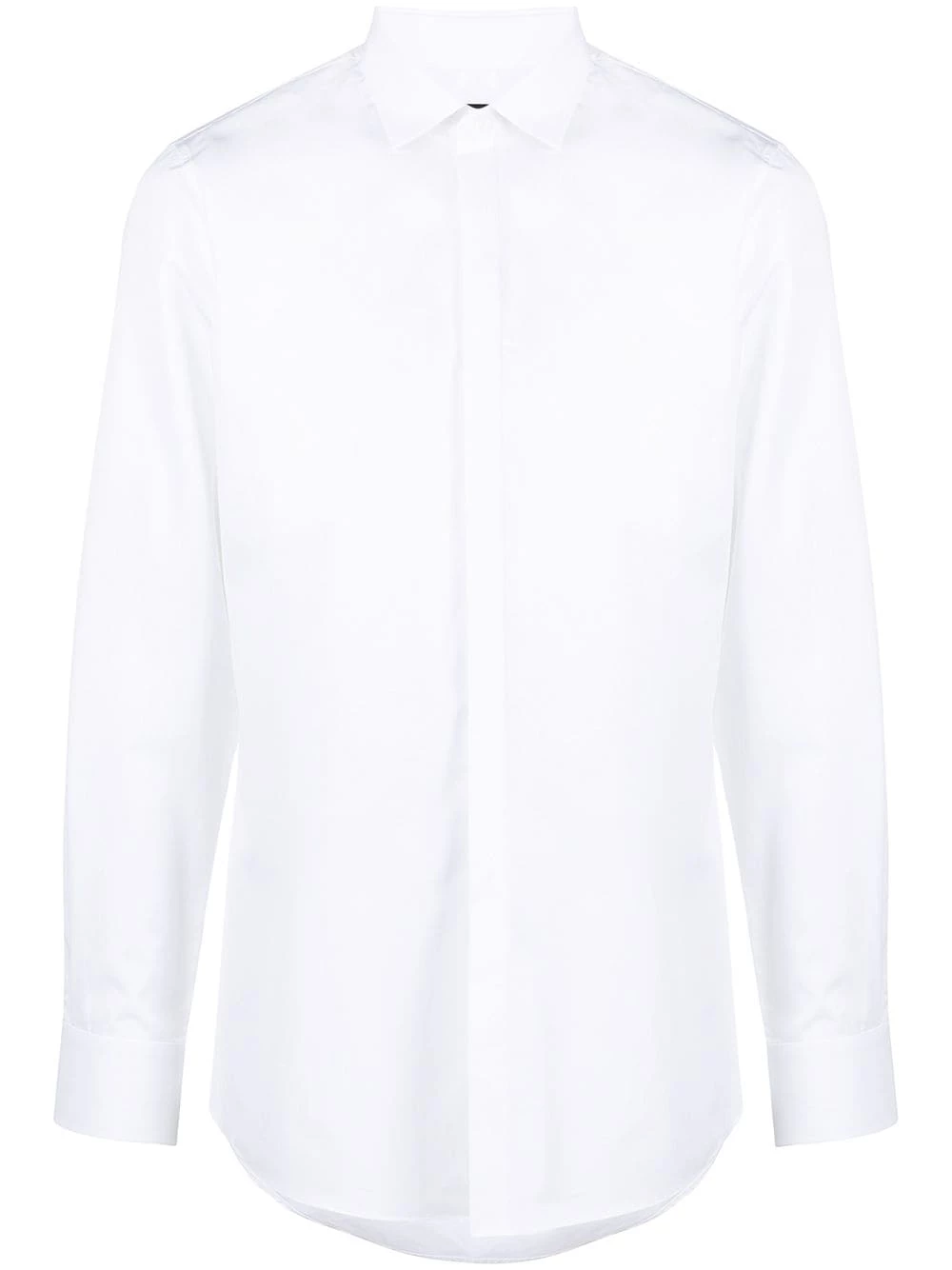 Col classique, boutonnière dissimulée sur le devant, manches longues, poignets boutonnés, ourlet incurvé. Couleur : blanc.