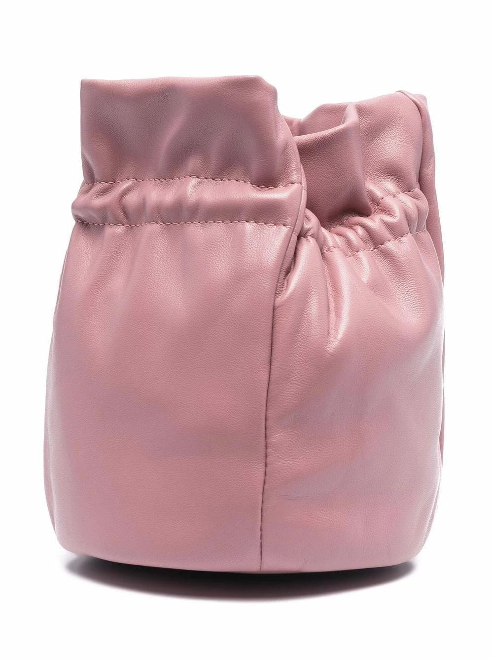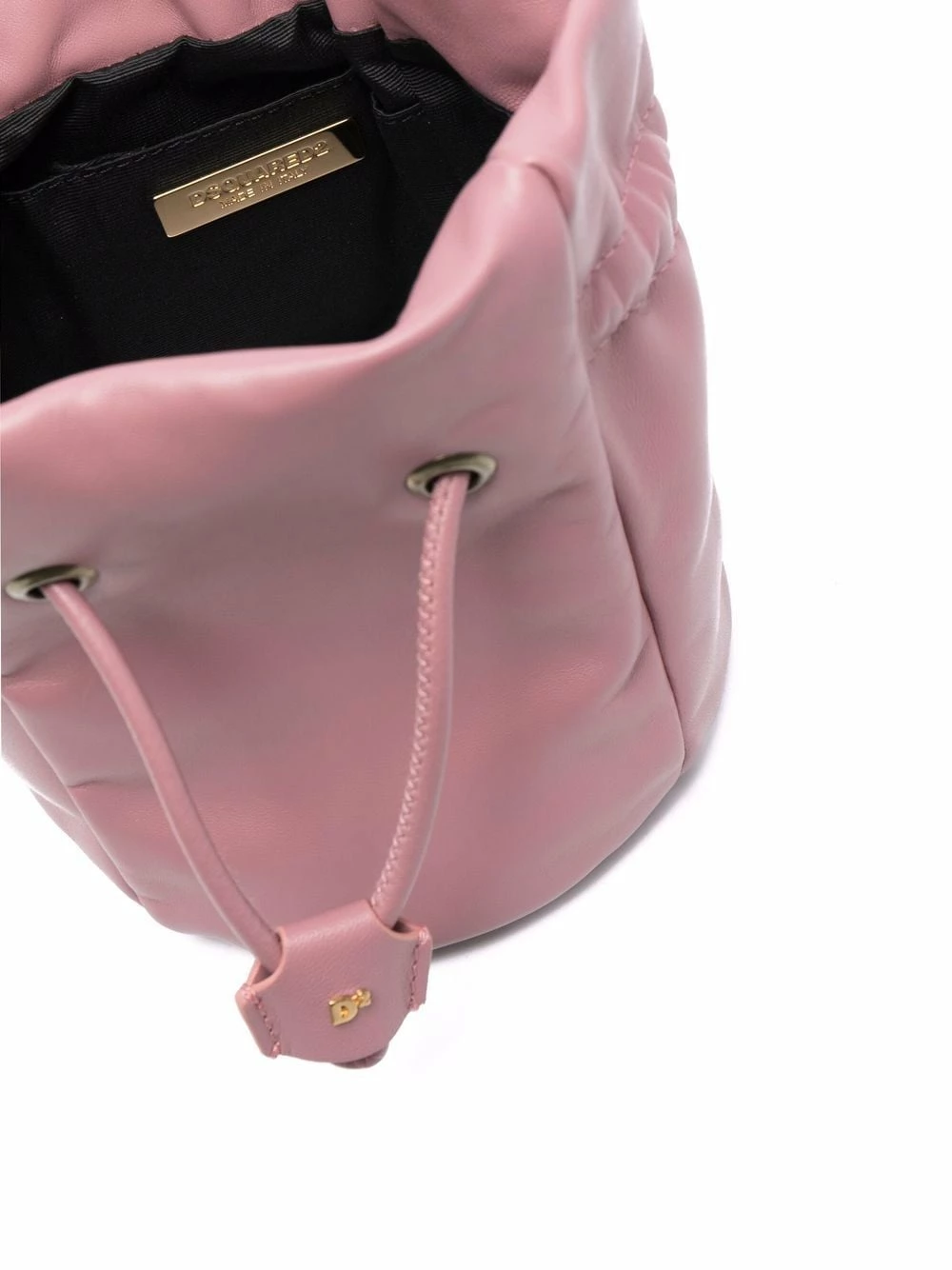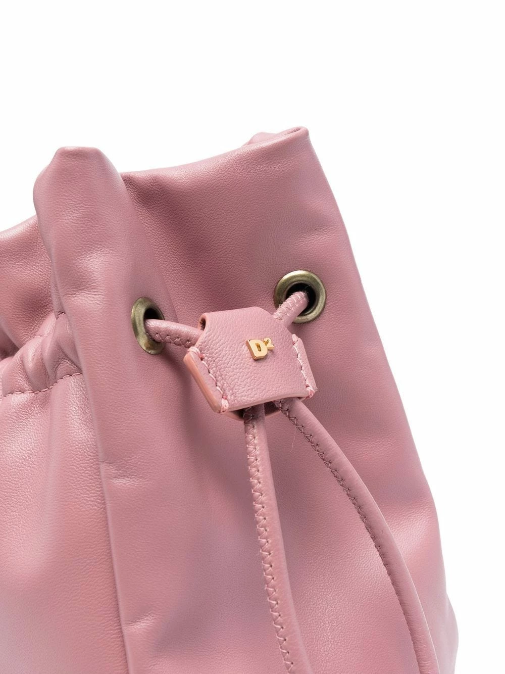 Rose, cuir, plaque logo dorée, lien de resserrage sur le dessus, compartiment principal, bretelle portée épaule unique.