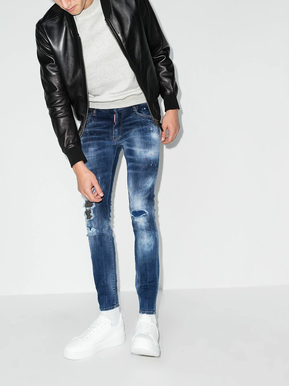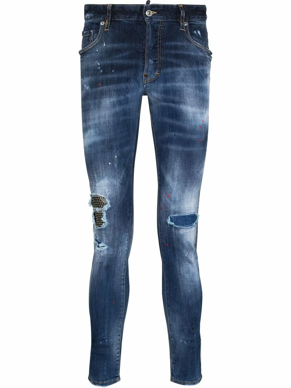 Coupe skinny, effet usé, finitions effilochées, taille mi-haute, fermeture à zip et boutons sur le devant, passants de ceinture, cinq poches classiques, construction stretch. Matière : denim stretch.