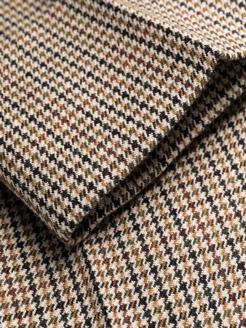 Motif pied-de-poule, taille haute, longueur crop, passants de ceinture, fermeture à zip et boutons sur le devant, deux poches latérales fendues, deux poches passepoilées boutonnées à l’arrière. Matière : laine vierge.